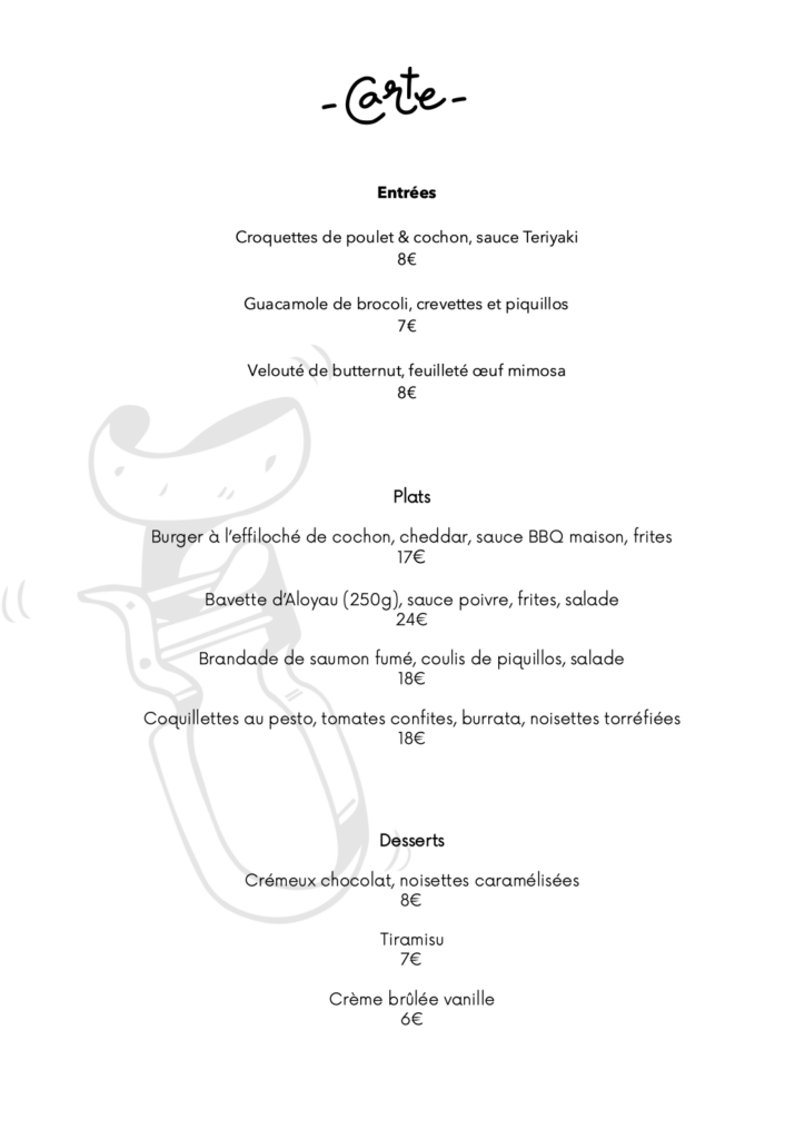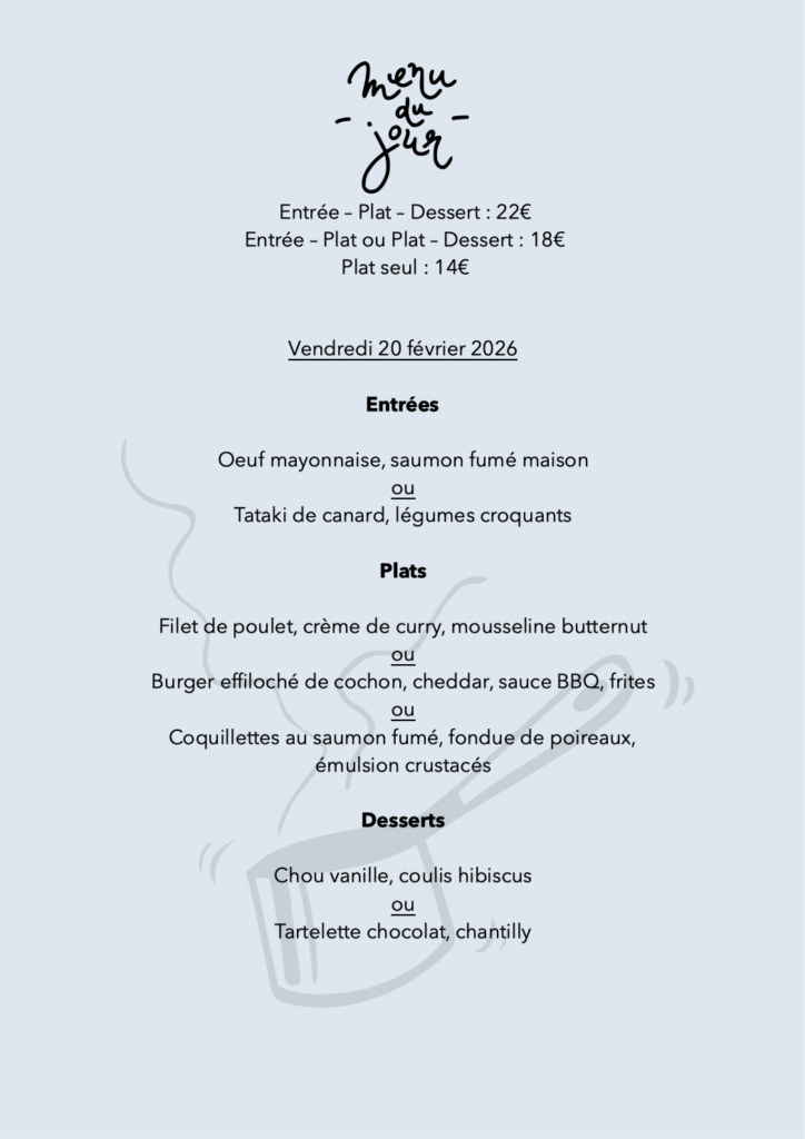 Ouvert du mardi au samedi, nous vous proposons un menu du jour tous les midis, avec bières à la pression et vins soigneusement sélectionnés. Nous vous ouvrons nos portes aussi les vendredis et samedis soirs, où vous pourrez retrouver notre carte.