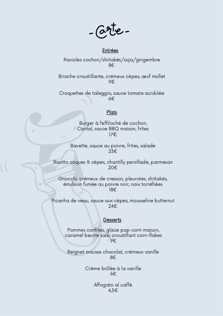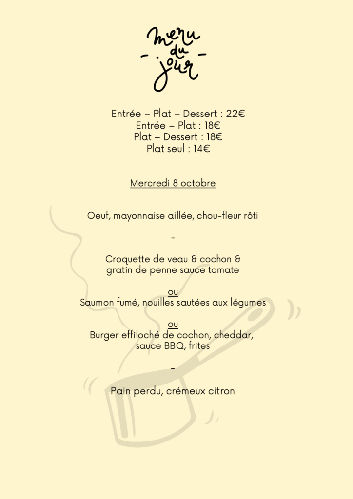 Ouvert du mardi au samedi, nous vous proposons un menu du jour tous les midis, ainsi qu’une petite carte, avec bières à la pression et vins soigneusement sélectionnés. Nous vous ouvrons nos portes aussi les vendredis et samedis soirs, où vous pourrez retrouver notre carte et des suggestions de plats à partager.